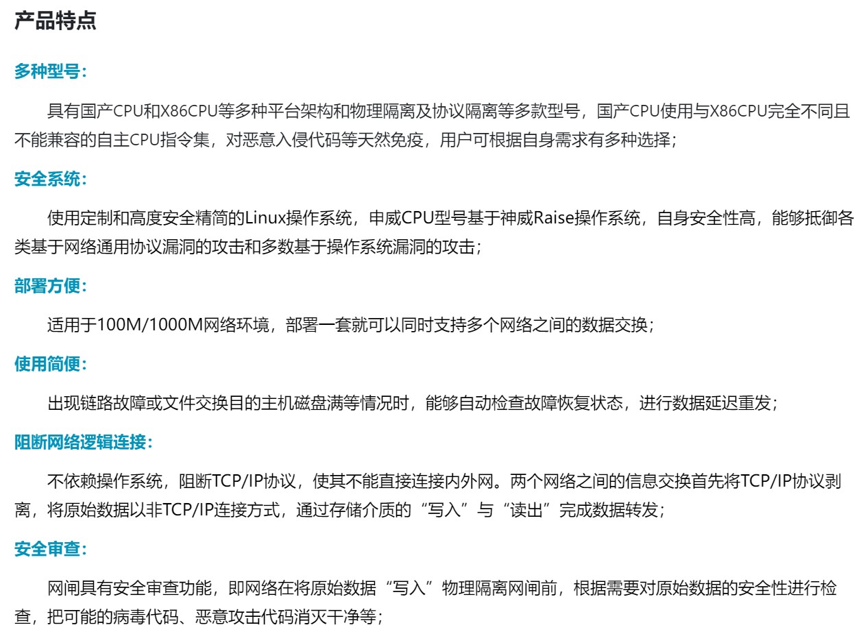 主要功能包括:隔離網(wǎng)閘針對當(dāng)前不同安全級別的網(wǎng)絡(luò)之間數(shù)據(jù)交換困難等痛點(diǎn)而設(shè)計,可廣泛部署于醫(yī)療、能源、企業(yè)等一系列場所的高安全級別網(wǎng)絡(luò)和其他級別網(wǎng)絡(luò)之間,是實現(xiàn)適度可控的數(shù)據(jù)交換的專用設(shè)備,幫助用戶應(yīng)對未知網(wǎng)絡(luò)安全挑戰(zhàn)的同時為工作提供恰當(dāng)?shù)谋憷?。該產(chǎn)品采用“2+1”架構(gòu),在內(nèi)網(wǎng)處理單元、外網(wǎng)處理單元和隔離數(shù)據(jù)處理裝置組成,具有極高的數(shù)據(jù)交換能力。數(shù)據(jù)交換支持10GB以上大文件傳輸、惡意代碼清除、應(yīng)用協(xié)議識別、病毒查殺等功能。該產(chǎn)品在保持高性能的同時,還具備占用空間少,功耗低等特點(diǎn),能幫助用戶有效降低運(yùn)營成本。